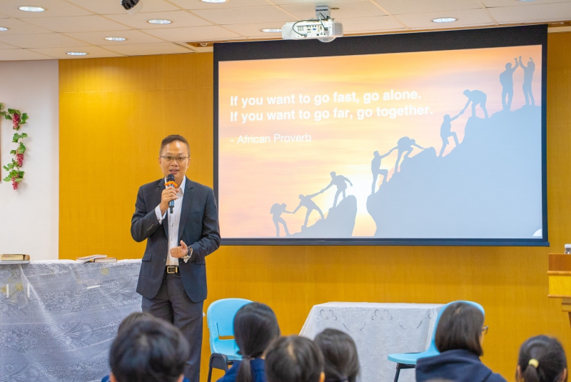 打氣會當日,首先由陳樂生老師介紹「同行者計劃」目的及安排,隨後王志偉校長致辭,滿懷殷切地勉勵參與計劃的中六級同學,提醒同學要每天自律且堅持溫習,便能達成目標。接著,本校邀請了多位校友分享寶貴的學習經驗,校牧周鳳鳴姑娘(小鳳姑娘)亦為中六同學祈禱。今年特別設置分組討論環節,班主任與學生圍坐交流,既關注同學的備試進度,也傾聽他們畢業後的升學、就業規劃,提供方向參考,同時提醒同學合理分配時間,避免影響備考。最後輔導組還為每位同學送上「打氣包」一份,以示鼓勵及祝福。學校以此溫暖行動告訴學子:備考路上並非孤軍,師長與同學們將始終相伴前行。
