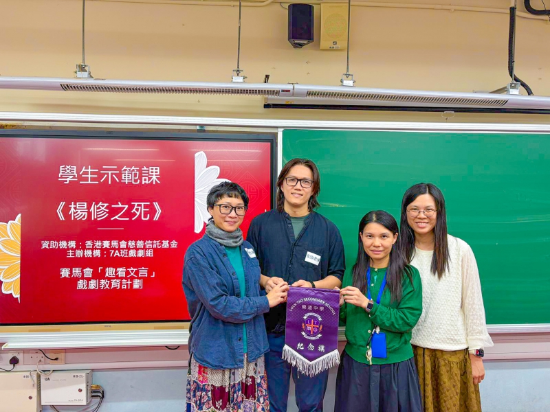 中文科活動-「賽馬會『趣看文言』戲劇教育計劃」文言文示範課本校中文科參加了由7A班戲劇主辦的「賽馬會『趣看文言』戲劇教育計劃」。該劇組於11月3日為中三同學帶來了一節生動有趣的中文課。是次課堂教授文言經典篇章——《楊修之死》,導師以「視覺化閱讀文言文」的戲劇教學法,讓書本的文字躍然眼前,更讓同學們透過親身演繹,加深對人物性格的認識。