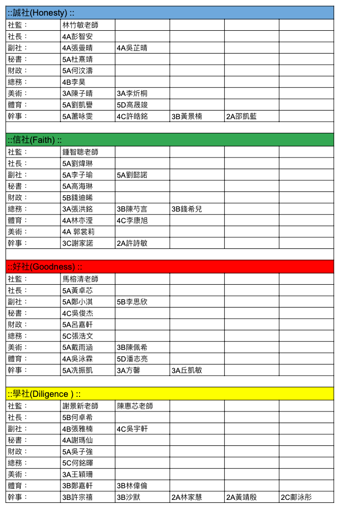 本校設有四社,分別為:誠社、信社、好社、學社。