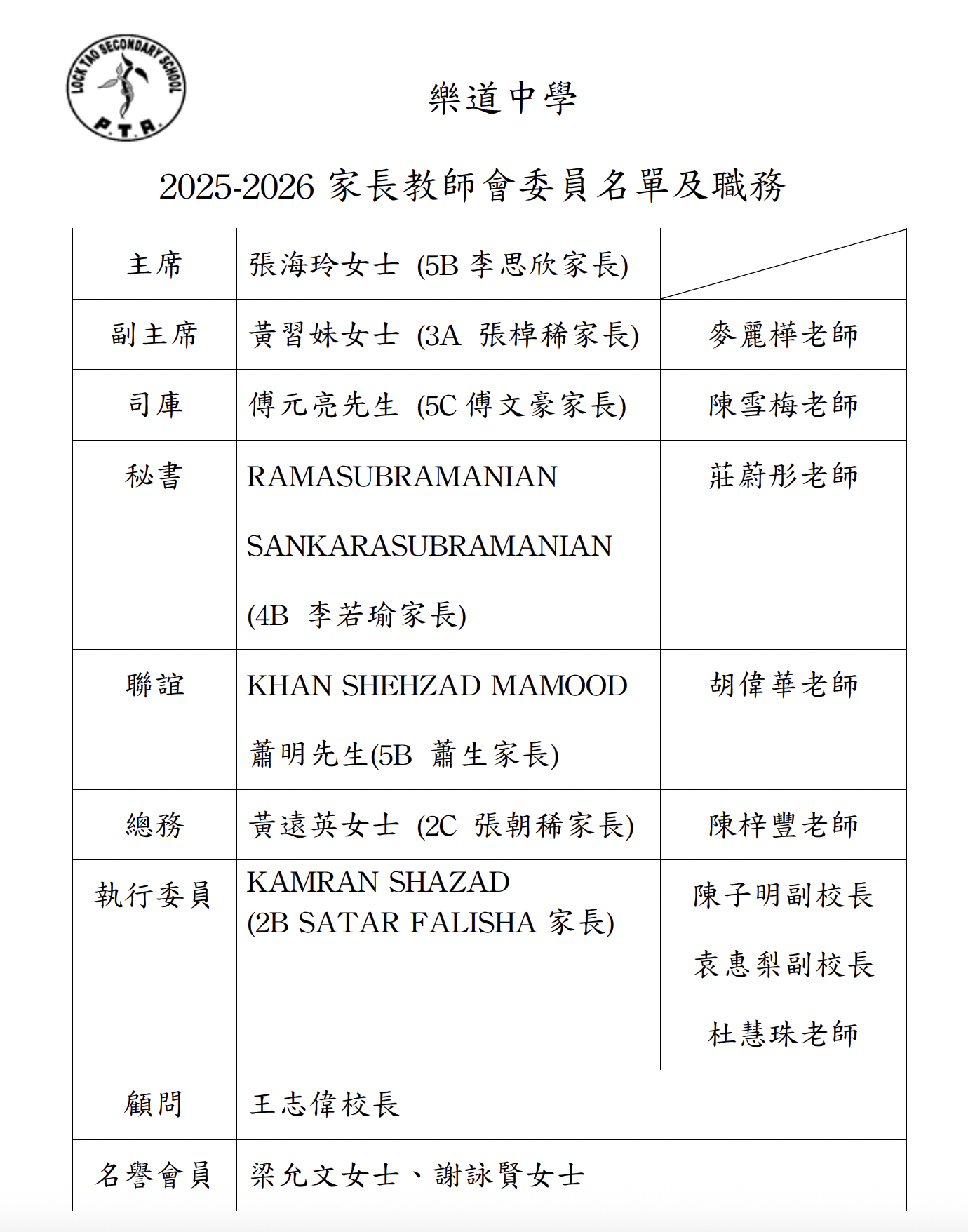2025-2026年家長教師會委員名單及職務