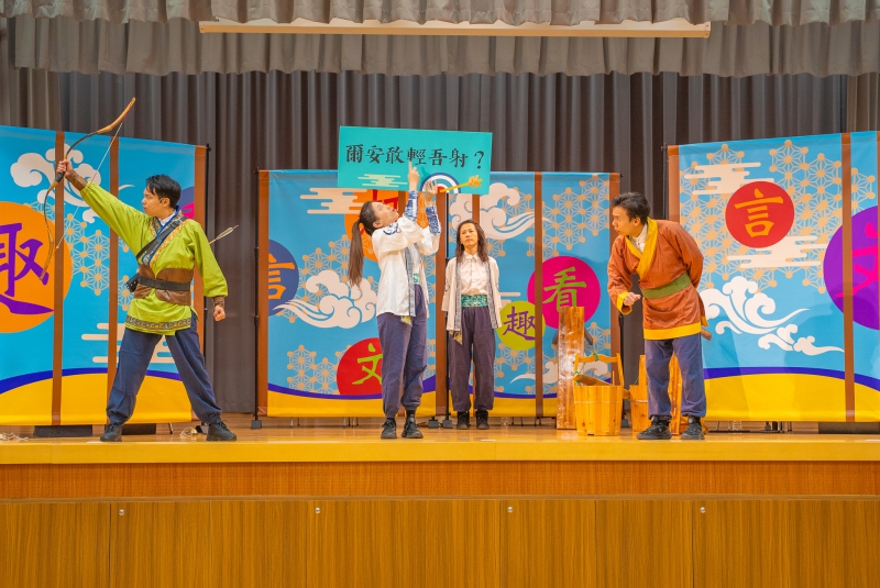 中文科活動-「賽馬會『趣看文言』戲劇教育計劃」到校巡迴演出本校中文科參與了由7A班戲劇組主辦的「賽馬會『趣看文言』戲劇教育計劃」,該戲劇組於10月14日到校為中二、中三級學生呈獻了一場別開生面的文言文戲劇演出。是次演出改編自兩篇文言經典——《賣油翁》與《木蘭辭》。演員以說書人身份靈活轉換角色與敘事角度,透過戲劇形式深入淺出地解說文言字句與閱讀技巧,同時傳遞作品的弦外之音,讓學生感受文言篇章中蘊藏的中華文化精髓。