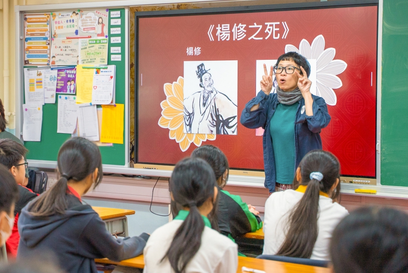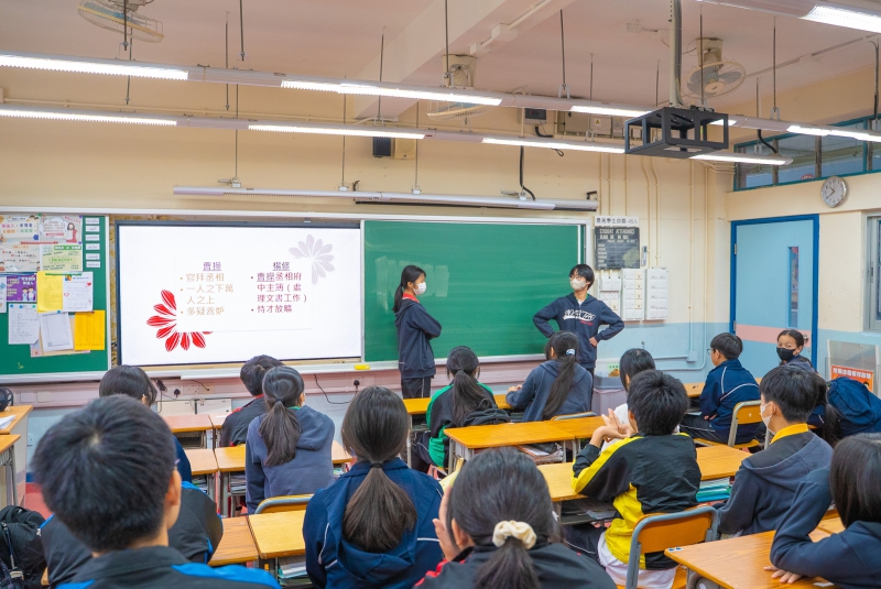 中文科活動-「賽馬會『趣看文言』戲劇教育計劃」文言文示範課本校中文科參加了由7A班戲劇主辦的「賽馬會『趣看文言』戲劇教育計劃」。該劇組於11月3日為中三同學帶來了一節生動有趣的中文課。是次課堂教授文言經典篇章——《楊修之死》,導師以「視覺化閱讀文言文」的戲劇教學法,讓書本的文字躍然眼前,更讓同學們透過親身演繹,加深對人物性格的認識。