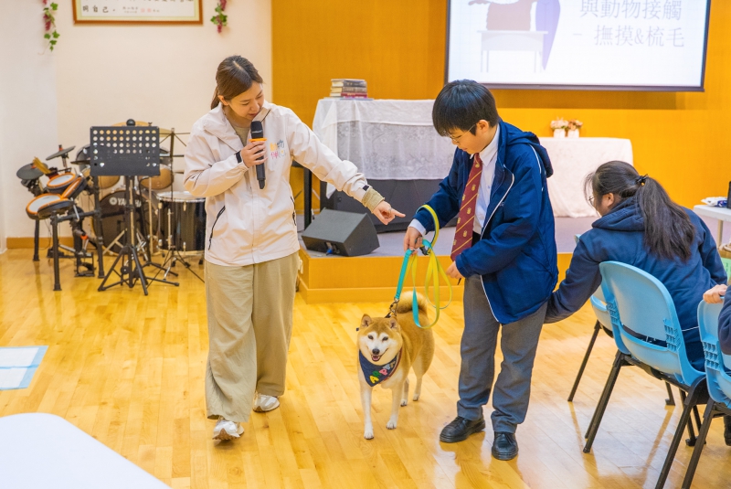 工作坊開始時,導師先向同學介紹小動物的基本情感表達,講解牠們如何透過身體語言反映情緒狀態。隨後,活動進入最受歡迎的「動物全接觸」環節。同學們在導師指導下,以小組形式近距離觀察小狗的行為,並學習正確的動物安撫技巧,包括溫柔地撫摸及梳理毛髮。部分同學更嘗試帶領小狗在場內散步。最後在「放鬆與減壓」環節,同學們在「伴心動物大使」陪同下靜心放鬆,將負面情緒拋開。